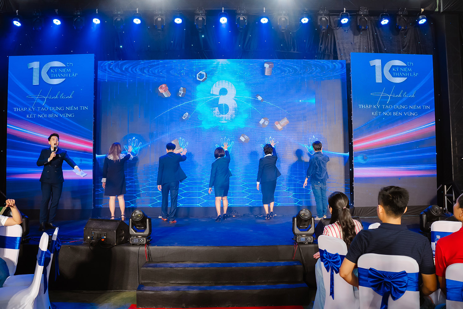 Khi dự án được chọn, cả team gần như sống cùng bản thiết kế suốt 3 tuần. Ngày – đêm – cà phê – deadline – rồi niềm vui khi từng ấn phẩm hoàn thiện: từ sân khấu 3D, backdrop động Animation, thư mời, standee, Poster văn hóa, photobooth lịch sử công ty đến từng chiếc hashtag nhỏ bé.